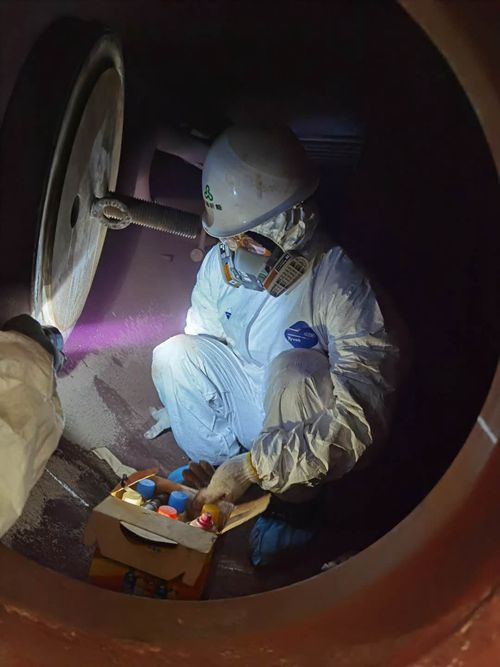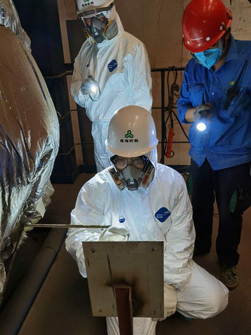 为了保障检验任务顺利完成,并保障检验人员人身安全,特检所组织精干力量会同检验小组,提前一周深入检验现场进行实地考察,在咨询中国特种设备检验研究院等多家具有检验经验的检验机构后,经多次研究论证,量身制定了详细周密的检验方案和应急处置预案,确定了检验重点。检验小组利用电站锅炉烟道检修的短暂窗口期,身着防护装备,进入密闭不透风、闷热高温的炉内,忍受着难以形容的刺激气味和因鼓风机运行而产生的巨大噪音,在漂浮着大量二噁英等剧毒致癌物质的极端检验环境中经过4个小时连续奋战,顺利完成检验任务。