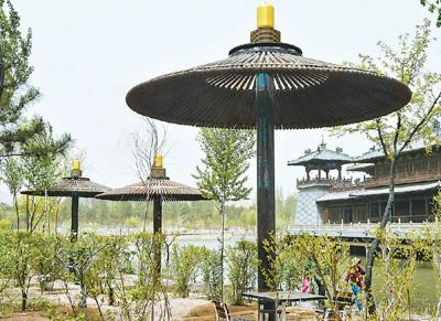 近年来,山西省大同市云冈石窟景区利用当地开山废石、石材厂废料、工矿淘汰机具等,进行景区美化、建设服务设施,走出一条固废利用的创新之路。图为云冈石窟景区内用废弃锅炉加热板制成的乘凉亭。柴 婷摄(新华社发)