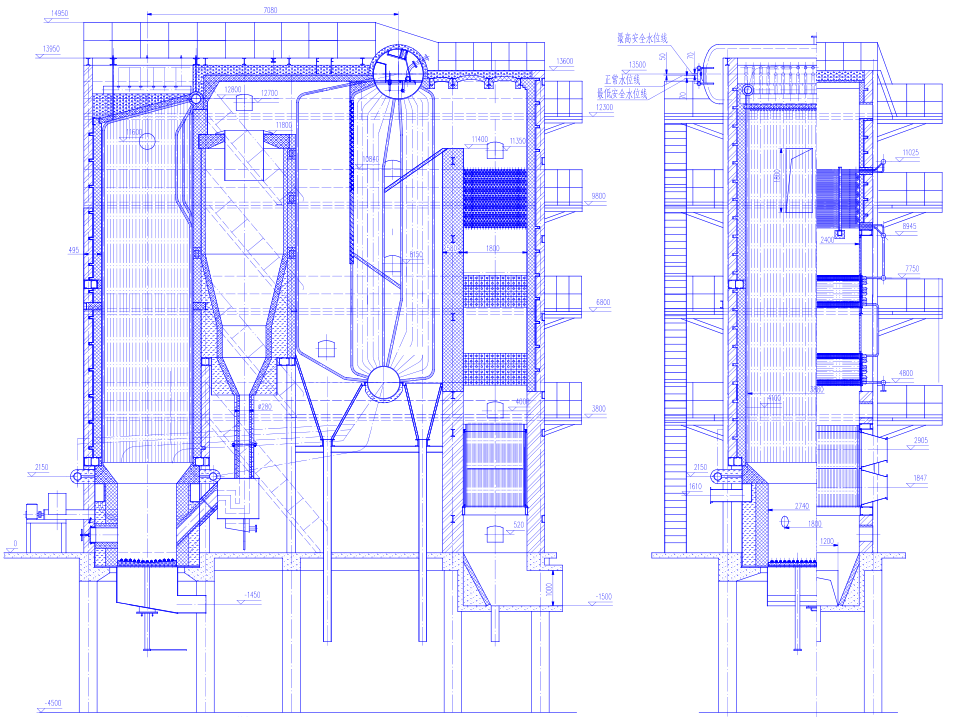 SHX30-1.25-AII 锅炉为双锅筒横置自然循环锅炉,锅炉房双层布置,锅炉运转平台高度一般为4500mm。锅炉本体基本尺寸:锅炉上锅筒为Φ1400×16,中心标高13500;下锅筒为Φ900×14,中心标高4800,安装完毕后外围尺寸为13940×8470×14900(长×宽×高)。