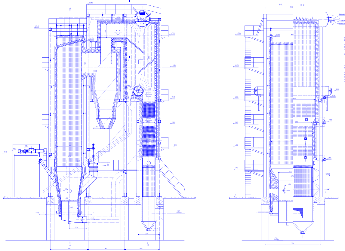锅炉前部炉膛采用全模式水冷壁悬吊结构;分离系统采用绝热式高温旋风分离器和自动平衡U型返料器;上下锅筒之间布置对流管束保证了足够的受热面;省煤器采用三级钢管省煤器结构;尾部布置空气预热器。