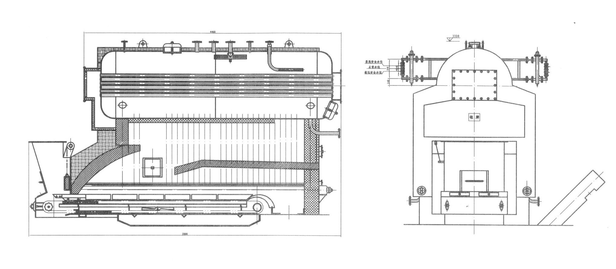 DZL系列锅炉为单锅筒纵置式水火管锅炉,燃烧设备为链条炉排。炉膛左右两侧水冷壁为辐射受热面,炉膛两翼和锅筒内螺纹烟管为对流受热面.锅炉本体在总体结构上采用上置锅筒,水冷壁管和集箱左右对称布置的形式。锅筒由筒体和前后管板组焊而成。该锅炉炉膛布置合理,燃烧效率高。本锅炉采用多种环保措施,如布袋除尘,双塔脱硫等,使锅炉烟尘排放达到国家环保标准。