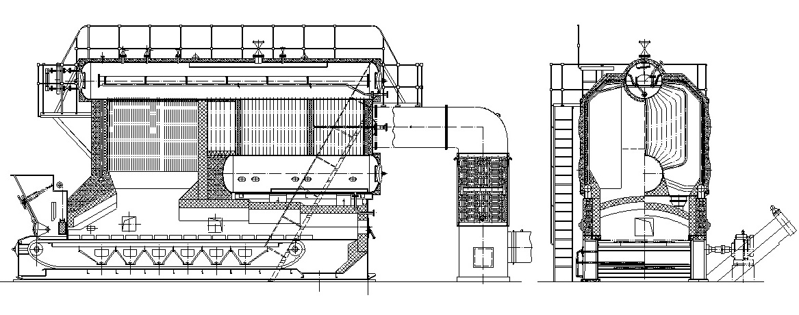 SZL生物质水管热水锅炉是卧式双锅筒纵置式链条炉排水管热水锅炉。锅炉采用快装或组装结构,2~4t/h为快装水管结构,在厂内全部整装后出厂,6~25t/h由上下两大件组成,上部大件为本体受热面,下部大件为燃烧设备。锅炉本体前端为四周布置的水冷壁,上部与锅筒连接,下部与集箱连接组成燃烧室,以吸收炉膛辐射热,其后端在上下锅筒之间布置密集的对流管束,燃烧后的高温烟气经过二次回程横向冲刷对流受热面后引至单独布置的省煤器,随后进入除尘器经烟囱。
